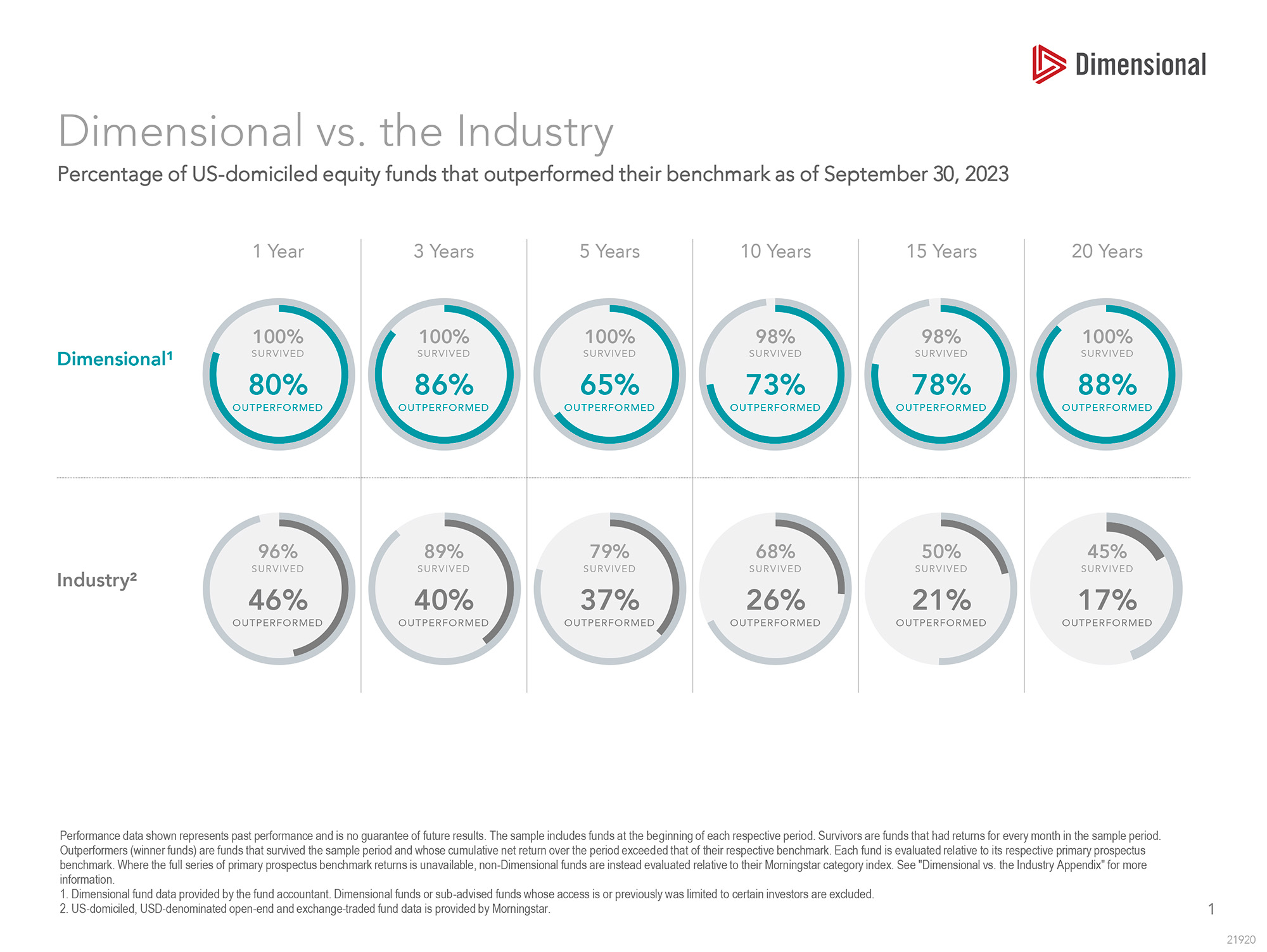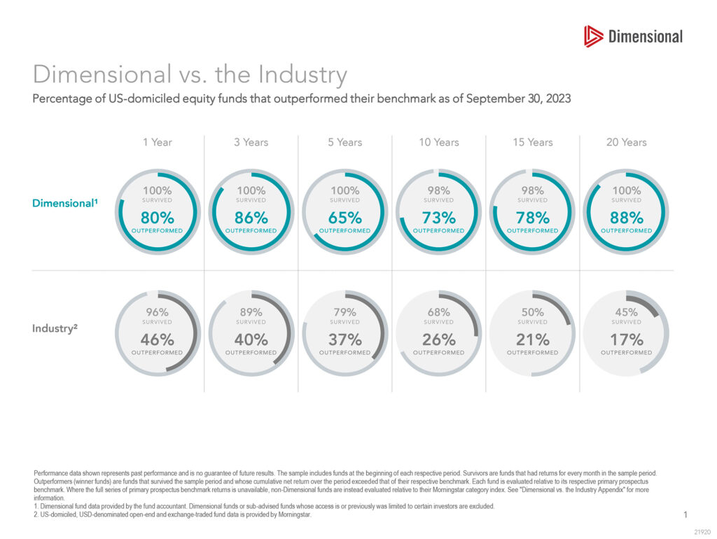 Just like with active management, we seek to beat our benchmarks, even after management fees. Unlike the poor survivorship of active managers, 88% of Dimensional’s equity funds have beaten their benchmarks over the last 20 years ending September 30, 2023, as shown in Figure 1 above. Drawing insights from financial science and Nobel Prize-winning academic research, Dimensional emphasizes areas of the market that are expected to produce high returns based on historical data.