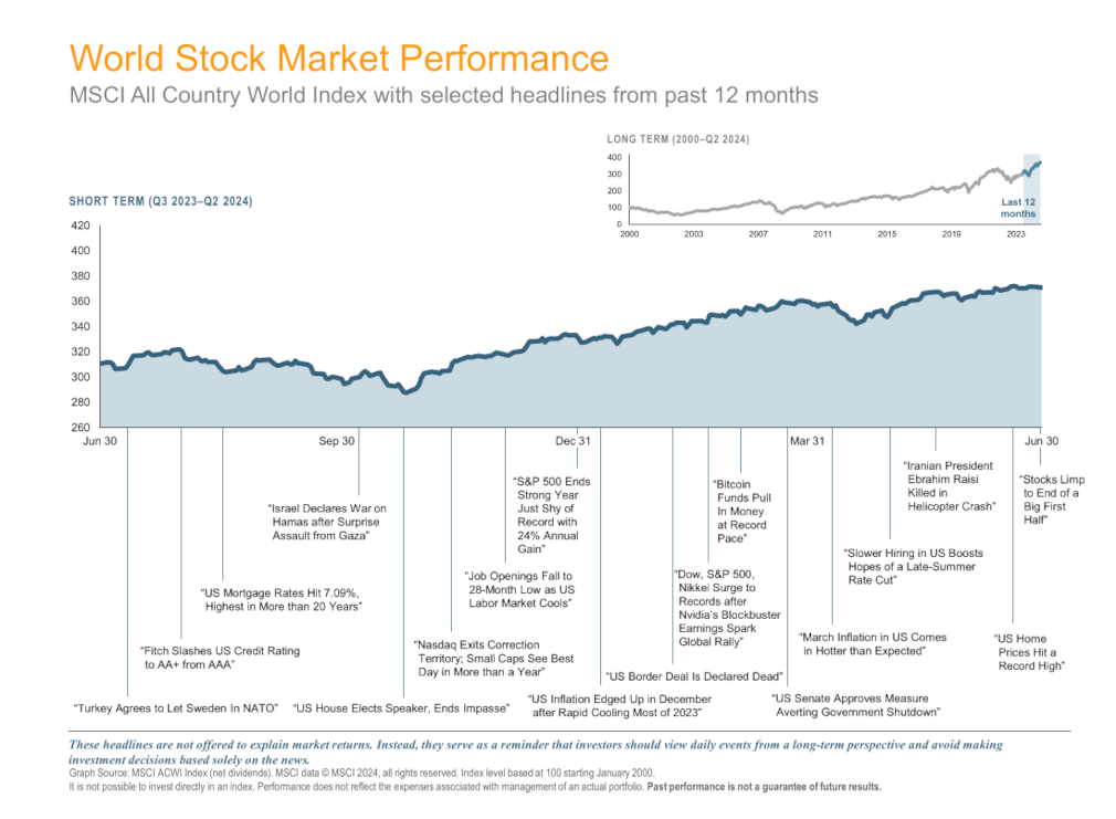 The chart above highlights some of the year’s prominent headlines in the context of global stock market performance as measured by the MSCI All Country World Index-Investable Market Index (MSCI ACWI IMI). We are not offering these headlines to explain market returns. But they do serve as a reminder that investors should view daily events from a long-term perspective and avoid making financial decisions based solely on the news.