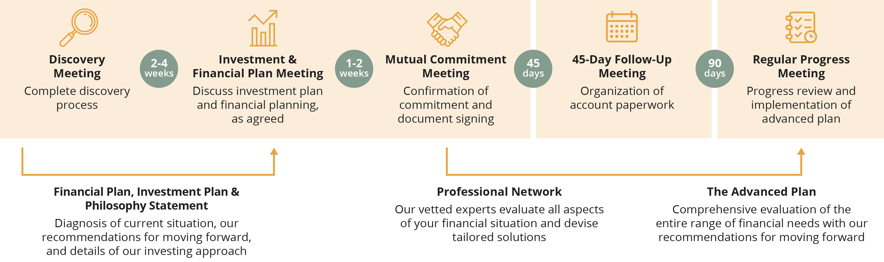 Our judicious 5-step process reveals each client’s unique concerns and needs. The foundation of our approach is our ability to uncover the entire financial picture, going far beyond asset management or estate planning into our clients’ most important values, relationships, and lifelong dreams. This process retains our objectivity and integrity and provides you with straightforward, customized, actionable advice.